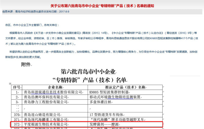近日,山東省工業和信息化廳公布了第七批山東省制造業單項冠軍企業名單,根源集團子公司青島尚德生物技術有限公司成功入選!
